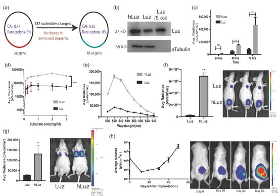 When the wild-type N. nambi gene was expressed in a mammalian cell, the Luz protein showed weak luciferase activity in the presence of its 3OH-hispidin substrate. We predicted that a reason for a weak luciferase signal might be the non-human codon bias in fungal expression systems affecting Luz expression and mRNA stability, leading to lower expression of Luz protein [,,]. Therefore, to rule out the codon bias and improve the scope of this fungal luciferase in biomedical applications as an independent reporter gene, we decided to perform human codon optimization of the native Luz gene. A thorough analysis of the cDNA sequence was performed for human cell expression using the GeneOptimizerTM web tool []. Results showed that the Luz gene has a codon adaptive index (CAI) of 0.71, with 52.15 GC content and 3% rare codons (Table 1). The lower CAI index and the presence of a significant number of rare codons affected the native Luz expression, thus impacting its overall expression in the human cell system. Thereafter, the human-codon-optimized Luz (hLuz) gene was synthesized by replacing 187 nucleotides in the Luz gene (Supplementary Figure S1a). The absence of rare codons in the hLuz DNA sequence was reconfirmed using the GeneOptimizerTM toolbox []. The CAI index value improved significantly to 0.92, along with 56.85% GC content (Figure 1a). It is also worth noting that nucleotide sequence comparison between hLuz and Luz using Needleman–Wunsch global alignment webtool showed a 78% identity match with no change in amino acid sequence (Table 2) [].
