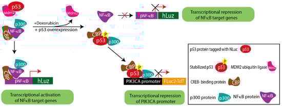 Substantial evidence suggests that in response to DNA damage, the p53 protein is activated, and the stabilized p53 thereby forms a complex with p300/CBP. On the other hand, the NF-κB complex is also known to bind to the p300/CBP to carry out its transcriptional activity []. Thus, considering the pool of CBP/p300 protein in cells at any given condition is constant, both p53 and NF-κB may have to compete to form complexes with CBP/p300 or one of the component proteins as a pre-requisite to exert their respective transcriptional regulation activity [,]. Either the over-expression or stabilization of p53 can make CBP/p300 unavailable for NF-κB binding, resulting in decreased DNA binding and transcriptional regulation of NF-κB [,,]. To analyze such complexity involved in PIK3CA gene regulation by both p53 and NF-κB candidate proteins, we would require at least three independent measures to simultaneously assess the events occurring in cells at any given time. Therefore, by combining the new pNF-κB hLuz sensor with the available luciferase vectors p53-NLuc fusion and pPIK3CA-FLuc2tdT, we designed a multiplexed assessment method to reveal complex regulation of PIK3CA gene expression by NF-κB and p53.