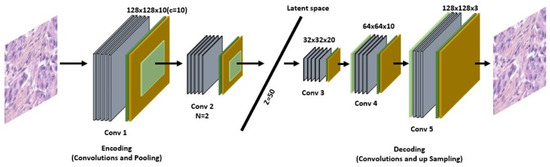 Deep learning approaches, in particular via auto-encoding architectures, make it possible to avoid manually defining the characteristics by computing a compressed representation of an image in a latent space via applying convolutional filters. Most of the work has been used to perform segmentation or kernel detection. Xu et al. [43] presented a stacked sparse autoencoder for the efficient detection of nuclei from high-resolution histopathological images of breast cancer. Raza et al. [44] summarized various unsupervised deep learning models, tools, and benchmark datasets applied to medical image analysis. Janowczyk et al. [45] presented stain normalization using sparse autoencoders (StaNoSA) to normalize the color distribution of test image. The architecture was applied on digital histopathology slides. Hou et al. [46] developed an unsupervised detection network by exploiting the properties of histopathological images. They identified nuclei in image patches in tissue images and encoded them into a feature map encoding the location of the nuclei.