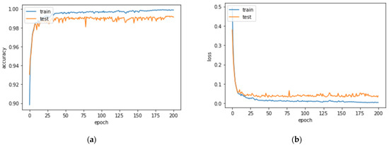 The models used in our work were trained over 200 epochs using a TensorFlow framework in an environment with GPU (Nvidia 1080-ti), 16 GB of RAM, and CPU-i7 intel. The figures illustrate the performance of the network on training datasets. Figure 7 shows the plot of loss and accuracy over the training epoch of U-Net.