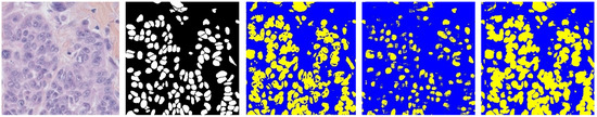 - Paramanandam, M. Automated segmentation of nuclei in breast cancer histopathology images. PLoS ONE 2016, 11, 162053. [Google Scholar] [CrossRef] [PubMed]