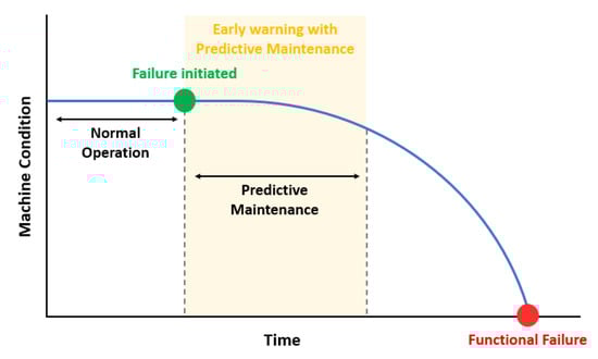Predictive maintenance (PdM) is a recent preventive maintenance approach to improve the performance and efficiency of manufacturing processes by increasing the life of equipment and ensuring sustainable operational management [13]. This results in reduced downtime, a lower number of unnecessary line stops, and reduced repair costs. It is important to maintain the highest efficiency and optimal condition of manufacturing equipment [14]. Methods are needed to ensure the efficiency of the equipment by minimizing machine downtime and preventing incidents in advance [13]. Since PdM is based on data collected from multiple sensors, it must address a variety of issues such as development cost, operations, and privacy [15]. To understand PdM, we need to define maintenance, which is the combination of all the techniques that allow a system to restore and maintain its ability to perform its required functions. As a simple example, Figure 1 is a potential failure diagram for PdM that takes into account time and the condition of the equipment [16]. Maintenance can be divided into four types. The first is simple replacement of parts when they fail. The second is scheduled periodic replacement of each part based on the failure history, which has the advantage of increasing the overall time efficiency of scheduled maintenance. However, periodic replacement of non-functional equipment is a waste of resources. The third method is proactive maintenance, which involves eliminating defective elements to improve the efficiency of the facility. The final method analyzes equipment data in attempt to identify and address abnormalities prior to failure. By solving problems such as periodic replacement and inaccurate analysis, it has the advantages of reducing the reliability and cost of facilities and extending their lifespan. Predictive maintenance is one of the core technologies of smart factories and is a technology that recognizes and predicts the causes and conditions of equipment failure and defects based on collected data for efficient management [17].