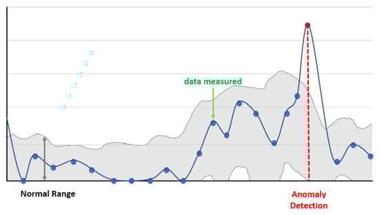 An anomaly is defined as atypical data, such as that generated by an unusual pattern or data with a low probability density. Anomalies are expressed in various terms, and the definitions vary depending on the field or problem. Thus, there is no specific methodology, and the chosen method is based on the defined problem. Anomaly detection aims to detect abnormal patterns or anomalies to identify differences from normal conditions (Figure 2). Anomaly detection, the process of detecting abnormal conditions in a dataset, is an important area of analysis in signal research. Several approaches can be considered for defining anomalies, especially for time series sensor data. These approaches can be grouped into six main methodologies: statistical and probabilistic methods, pattern matching methods, clustering method, distance-based methods, predictive methods, and ensemble methods [23]. Most of the data used in the industrial field are time series data, and statistical research on anomaly detection using time series data has been conducted for a long time, most commonly using methodologies that consider the mean and variance over time. To achieve good performance and cost reduction with time series data, anomaly detection models need to be designed based on the context [24]. With such data, anomalies occur at a specific point in time. Most methodologies are based on Long Short-Term Memory (LSTM) or Convolutional Neural Networks (CNNs).