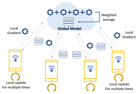 Federated learning is a technology in which multiple local clients and a central server cooperate to learn a global model in a situation where data are decentralized, and local clients are IoT devices, smartphones, etc. After the first study [31] on such learning was published in 2015, it was introduced on Google’s blog [32] in 2017, and is starting to receive attention as a technology for KEYBOARD application. Federated learning enables learning without issues with data privacy and leakage. Most DL/ML models learn based on big data, which can cause privacy and security issues. Federated learning stores the data on each individual’s local client rather than on a centralized server, trains locally, and updates a model on a centralized server with the parameters of the updated model (Figure 3) [33]. The goal is to avoid data conflicts while protecting privacy. Multiple clients coordinate with one or more central servers for a distributed machine learning setup. When network traffic and costs increase during the training process, federated learning can reduce costs by only receiving updates from local models. The basic idea behind federated learning is that the central server modifies the global model with local updates. However, the central server is a single point of failure, which can be problematic. In federated learning, local devices or communities collaborate to learn. In comparison, distributed learning involves model training in an environment where data are stored on multiple servers.