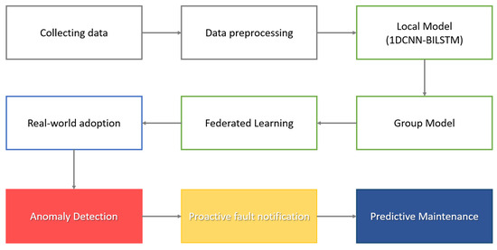 Figure 5 shows the predictive maintenance process using federated learning. First, data are collected for each facility in real time through sensors or recording logs. Then, the raw data are analyzed and preprocessed to increase anomaly detection, improving the quality of the data to extract useful information. Data preprocessing improves the quality of the data, removes noise or missing values, extracts useful features, and formats the data. The preprocessed data are divided by device or group to perform federated learning. Federated learning is used to build models while protecting data between individuals or organizations in a distributed data environment. Each client (device or group) trains a model using local data, shares information on a central server, and combines the models to create an improved global model. The predictive maintenance model generated through federated learning is applied to the actual manufacturing process, and data from equipment are collected in real time and analyzed using PdM models. The model detects patterns in the data based on anomaly detection algorithms and sends notifications to field managers when there is an anomaly in the signal. After receiving the notification, the field manager can inspect the equipment and take necessary actions. This allows rapid identification and resolution of equipment anomalies, ensuring efficient use and maintenance of equipment. This process can be used to build a PdM system with data preprocessing and federated learning to analyze data in real time and increase efficiency and reliability in detecting and acting on abnormalities.