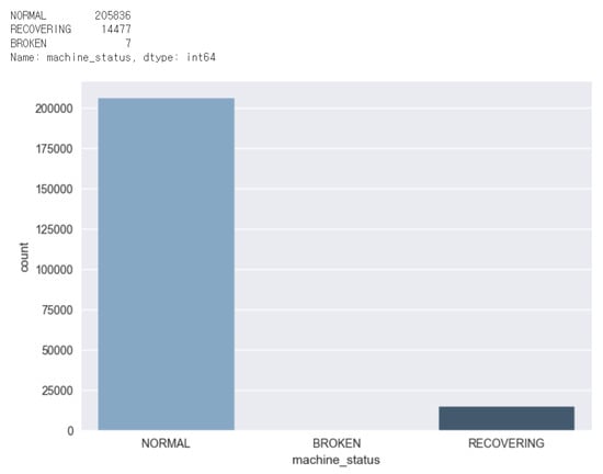 As shown in Figure 7, the data is unbalanced with a large difference in the number of data in each class. In the figure, there are 205836 ‘NORMAL’ data, 4477 ‘RECOVERING’ data, and 7 ‘BROKEN’ data. Since the number of ‘RECOVERING’ and ‘BROKEN’ classes is small compared to the number of ‘NORMAL’ classes, we combined ‘RECOVERING’ and ‘BROKEN’ into one class (anomaly).