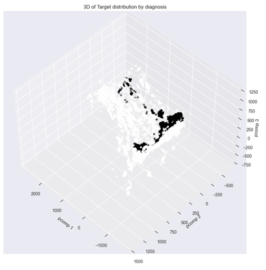 We also used PCA to reduce the characteristics of the data (Figure 8). Principal component analysis revealed that 73.5% of the variance in the original dataset lies on the first principal axis, 8.3% on the second principal axis, and 3.6% on the third principal axis. This reduces the dimensionality of the data from 52 to 3.