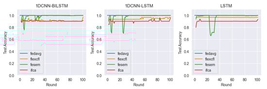 Figure 9 and Table 2 compare the test accuracy of each framework and model. The experimental results show that FlexCFL-1D-BILSTM achieves 97.2%, FlexCFL-1D-LSTM performs 96.5%, and FlexCFL-LSTM performs 96.6% in terms of accuracy. Within the FlexCFL framework, we can see that 1DCNN-BILSTM has the highest accuracy. Among the federated learning frameworks, FedAVG and FeSEM have the highest accuracies in the 99% range, while IFCA has the lowest accuracy. However, we can see that the overall accuracy of the models is between 91% and 99%. For FeSEM, there seems to be a lot of variation in the initial accuracy across the three models.