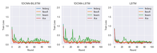 Figure 10 shows a visualization of the train loss of each framework versus the model. We can see from the train loss that the models are generally well trained, except for FeSEM. In the case of FeSEM, we can see that the train loss is somewhat deviated, suggesting that the model has not yet learned enough and has reached a local minimum, or that there is insufficient training for certain classes due to data imbalance. The LSTM tends to have the most stable decrease in train loss, while the 1DCNN-LSTM is the most unstable.