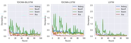 Figure 11 shows a visualization comparing the discrepancy of the models with each framework. From the experimental results, we can see that FeSEM tends to have a very high variance of discrepancy values for all three models, which indicates that the models are likely overdispersed. We can see that FeAVG has the lowest discrepancy among all three models. Overall, 1DCNN-LSTM tends to have the largest deviation from the discrepancy value, and LSTM has the lowest.
