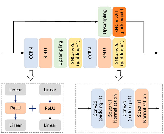 The structure of the residual block in the generator of our SUGAN. This residual block consists mainly of four types of layers: CCBN, upsampling, SNConv2d, and ReLU. The difference between the two kinds of SNConv2d blocks is that their convolution kernel sizes are different. The convolution kernel size is 3 when the padding is equal to 1, and 1 when the padding is equal to 0.