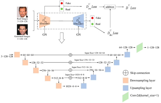 U-Net GAN [46] uses U-Net [43] as the main body of the network architecture for the discriminator. The U-Net-based discriminator consists of an encoder for feature extraction and a decoder for detailed per-pixel analysis of the images, prompting the generator to focus on both the global and local consistency between generated and real images. At the same time, skip connections are used to realize feature fusion to retain more texture and spatial information. The network is also simple in structure and small in number of parameters. With the help of this structure, the performance of the discriminator is greatly improved, making the generator’s task of cheating the discriminator more difficult, thus improving the performance of the generator.