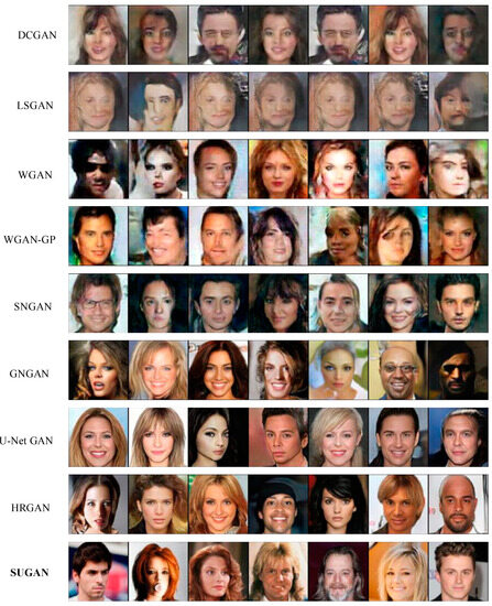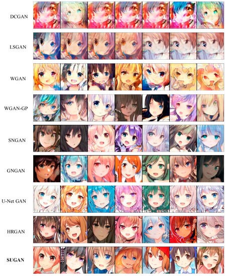 In order to verify the performance of our SUGAN in the unconditional image generation task, we compared it with eight mainstream GANs: DCGAN [35], LSGAN [36], WGAN [54], WGAN-GP [57], SNGAN [47], GNGAN [48], U-Net GAN [46], and HRGAN [65]. All the above models are representative in further exploring the generative potential of GANs. Among them, to improve the performance of GANs, DCGAN, WGAN, and U-Net GAN modify the network architectures, WGAN-GP and SNGAN explore the function of normalization strategies, and LSGAN modifies the loss function. HRGAN presents a novel concept by introducing an image calibration network to enhance the image resolution during the training process of the generator. This approach allows the generator to learn more feature information from higher-resolution images, and thus the quality of the generated images can be greatly improved. The comparison results are shown in Table 3, Figure 6 and Figure 7, where our results are emphasized in bold, which also applies to the remaining figures and tables in this paper. Note that the comparison among U-Net GAN, GNGAN, and our SUGAN constitutes the ablation experiment.