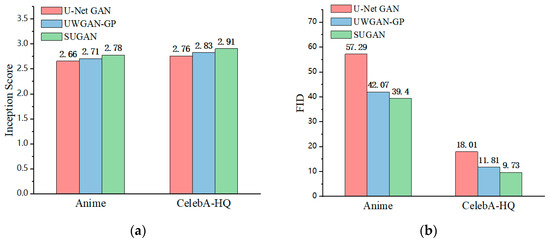 As can be seen in Figure 9, on the Anime dataset, UWGAN-GP and our SUGAN improve the IS score by 0.05 and 0.12, respectively, and the FID score by 15.22 and 17.89, respectively, compared to the original U-Net GAN. On the CelebA-HQ dataset, the comparative results are similar. These quantitative comparison results show that both of the two improved models can achieve improvement for image generation quality, and our SUGAN obtains better results.
