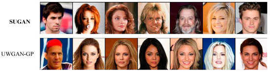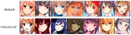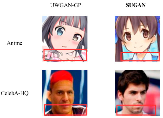Figure 10 and Figure 11 show that both of the two improved models also have good performance in alleviating the mode collapse problem. However, the performance of our SUGAN is stronger, which is reflected in their ability of processing image details. Figure 12 presents an enlarged comparison of image details, where we can see that our SUGAN has excellent abilities of processing facial details and clothing details, while UWGAN-GP functions poorly in processing clothing details (see the regions marked by the red rectangles). On the Anime dataset, the clothes of the characters restored by UWGAN-GP are blurry and lack realism. On the CelebA-HQ dataset, the character generated by UWGAN-GP displays white highlights above his cloth, accompanied by blurred edges. Therefore, visual comparison also shows that compared to combining with WGAN-GP, combining with gradient normalization (as our SUGAN) is a better solution to improve the original U-Net GAN.