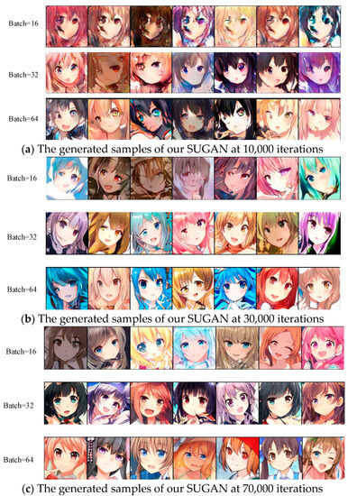 To verify the impact of batch size on the performance of our SUGAN, three different batch sizes were used to train the model on the Anime dataset, and the generated results were recorded when the iteration number was 10,000, 30,000, and 70,000, respectively. Some of the results are shown in Figure 13. In the experiments with 10,000 and 30,000 iterations, the model generates samples of higher quality and diversity when trained with a batch size of 64. When the number of iterations is 70,000, the generated sample quality of the three batch sizes is similar. The above comparison shows that when the iteration number is not very large, the batch size matters a lot, and large batch sizes tend to lead to better results; but as the iteration number becomes larger, the influence of batch size becomes weaker, and relatively small batch sizes can also lead to good results after enough iterations.