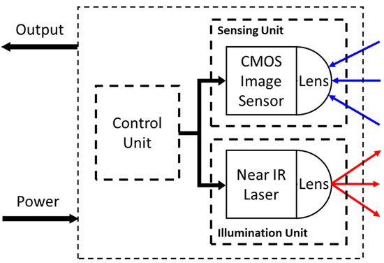 A schematic block diagram of the Gated Imaging system. The system consists of two main modules—the illumination unit, built of a Near Infra-Red (IR) laser, which emits the laser pulse (marked in red), and the CMOS Image sensor, which receives the reflected light (marked in blue). A control unit controls both units, gating each unit according to the timing diagram.