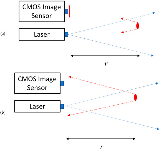 The basic principle of gated imaging was described earlier for various applications [12,13]. A camera and a pulsed laser are placed close to each other. The idea is to send a pulse of light and hold the camera in the off position until an optical echo from a specific range (r) returns to the camera, as shown in Figure 1.