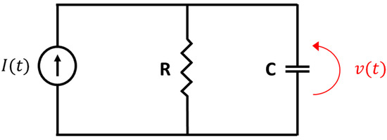 The electrical network model of the sensing junction. A current source I(t) injects current to the circuit. C represents the junction capacitance and R represents the effective resistance of the junction. The voltage over the capacitor C is v(t), which appears in red.