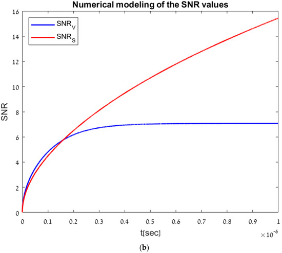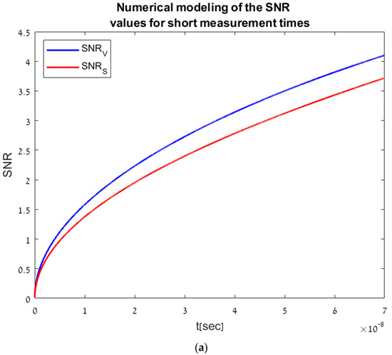 For typical values of [14] and [11], the resulting value is . For example, to measure depth in a range of up to 10 m, the pulse travelling time is , resulting in . From Figure 4a, showing the SNR values for measuring times of up to 70 [ns], it is noticeable that the SNR values are higher in the temporal voltage method than the accumulative method, as expected due to the short-time pulse characterization of this method. For longer measurement times, meeting the condition , as seen in Figure 4b, the temporal method SNR values converge into a constant value whereas in the accumulative method the SNR values keep its square root trend, resulting in a higher SNR value, meaning that the accumulative method is more suitable for longer measurement times—the higher the measuring time is, the more photo-carriers are created in the photodiode, resulting in a higher SNR.