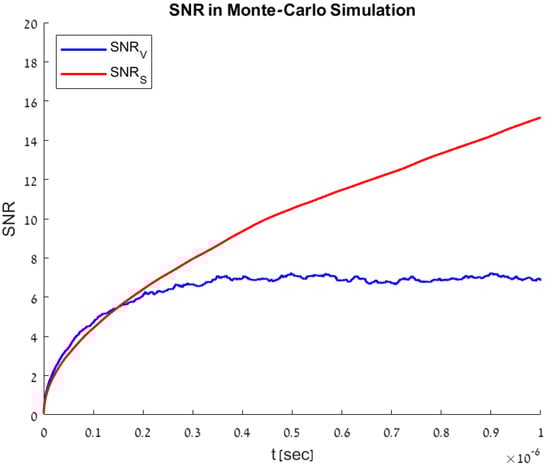 To validate the model results, a Monte Carlo simulation [15] was performed on the model described in Section 3. The simulation was composed of 1000 realizations, each randomizing the total amount of photo-carriers injected into the model according to Poisson distribution and the time in which each of the photo-carriers were injected into the model. The model response was then calculated for both temporal and accumulation methods according to Equations (3)–(5). Mean and variance values over all the realizations were calculated, from which SNR values were extracted. The Monte Carlo simulation results are shown in Figure 5. These results match the numerical modeling detailed in Section 4.1 and shown in Figure 4b.