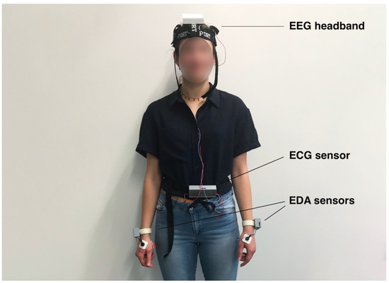 The proposed BSN consists of a six-channel EEG headband, two SPR sensors, and a dual-channel ECG sensor. These sensors were specifically developed by the authors and their detailed specifications and performance levels are described in [25,26]. Figure 2 shows a subject wearing the sensors, providing a visual representation of their placement and usage. The custom-designed sensors provide several advantages compared to commercially available sensors, including (1) access to raw data, (2) accurate synchronization of different signal modalities with time alignment up to 50 ms, (3) real-time integration of sensor signals facilitated by a custom-designed GUI, and (4) full sensor characterization, providing resolutions of 180 nV, 5 V, and 2 V, and linearities of 0.4% (6 V), 0.15% (30 V), and 0.05% (5 V) for the EEG, SPR, and ECG sensors, respectively.