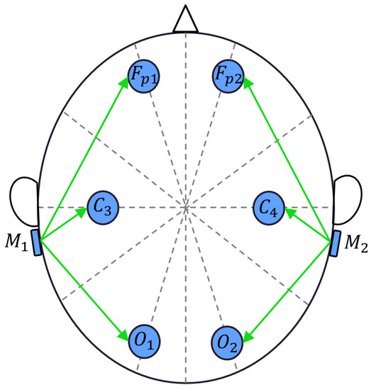 The EEG headband captures six EEG signals from the electrodes placed on the scalp according to the 10/20 standard [27]. The selected electrode positions include Fp1, Fp2, C3, C4, O1, and O2. The two mastoids, M1 and M2, serve as reference points for the left electrodes (Fp1, C3, O1) and the right electrodes (Fp2, C4, O2), respectively. The sensor measures the differential voltages between each electrode and the reference points, as shown in Figure 3. The signals are then conditioned by the sensor to convert low-level differential voltages with a full scale of mV to high-level single-ended voltages, with a full scale of V. The conditioned signals are acquired by a 12-bit analog-to-digital converter, and through oversampling techniques, the data achieve a resolution of 14 bits, corresponding to 180 nV. The digitized signals are then sent to a Wi-Fi module via UART and transmitted wirelessly to a laptop via an access point. The system exhibits linearity in the order of 6 V, operates at a sampling rate of 200 Sa/s, and has a bandwidth in the range of Hz.