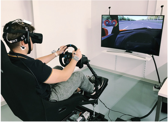 An experiment was carried out in the BioSensLab laboratory [28], involving a group of 19 participants comprising students and employees of the University of Udine. The age of the participants was in the year range, with an average driving experience of approximately 7 years. All participants were in good health, free from any neurological or psychiatric disorders, and had normal or corrected-to-normal vision. They were instructed to abstain from consuming alcohol, caffeine, and nicotine for a minimum of 8 hours before the experiment. Prior to the experiment, participants were provided with detailed information about the study and were required to read and sign an informed consent form to record their physiological signals. For the experiment, sensors were placed on the head of each participant for EEG recordings, on both hands to capture SPR signals, and on the chest to record ECG signals. Detailed illustrations of sensor placements can be found in Figure 2 and Figure 4. The driving simulation setup used in the experiment comprised a three-axis moving platform (DOF Reality Professional P3), a curved screen, a Virtual Reality (VR) headset (Oculus Rift), a racing seat, and a force-feedback steering wheel with pedals and a gearbox (Logitech G29). This combination of equipment provided a realistic driving experience for the participants.