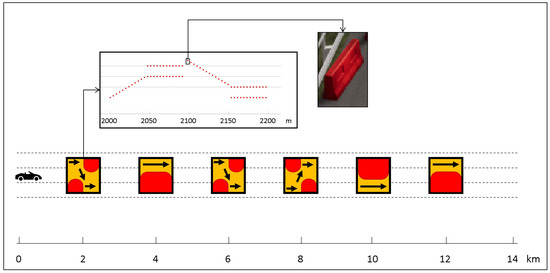 All participants started with manual driving on a 14 km highway route that included six obstacles positioned along the way. These obstacles were placed in six sections of the highway, each characterized by road works indicated by Jersey barriers. Barriers were randomly selected from four different types: right-to-left pass, left-to-right pass, right pass, and left pass. Each obstacle spanned a length of 200 m, with distances of 2 km between them. The first obstacle was located 2 km from the starting point of the course. This phase, referred to as “Manual1”, was completed by the participants in approximately 7 min, with an average driving speed of around 120 km/h. The Manual1 track is illustrated in Figure 6.