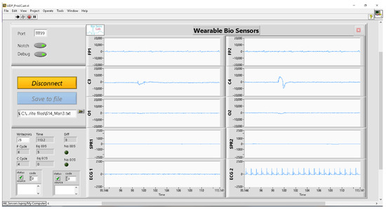 To facilitate data collection, synchronization, visualization, and storage from each sensor, a custom GUI was developed in the LabView environment [29]. The GUI front panel, illustrated in Figure 7, presents real-time plots of signals acquired from all sensors. It includes a “connect/disconnect” button for initiating and halting signal acquisition. The acquired signals can be conveniently saved to a designated folder using the “save to file” button. Additionally, the GUI offers the option of applying a notch filter for eliminating unwanted power line noise. The GUI, running on the computer, receives the UDP packets from the ECG and EEG sensors, unpacks and aligns them, prepares the time base, and creates a dataset that includes samples from all sensors for each time instant. The dataset consists of the following columns in this order: time, Fp1, Fp2, C3, C4, O1, O2, SPR1, SPR2, ECG1, ECG2. In cases where a sensor stops or delays the transmission of data due to a shortage in the wireless connection or internal clock drift, the GUI handles these missing samples by inserting zeros into the dataset. Throughout the experiment, there were no instances of lost wireless connection, and only a few zeros were inserted into the dataset due to the sensor clock drifting. To ensure data integrity, these zero values were linearly interpolated between the preceding and succeeding samples.
