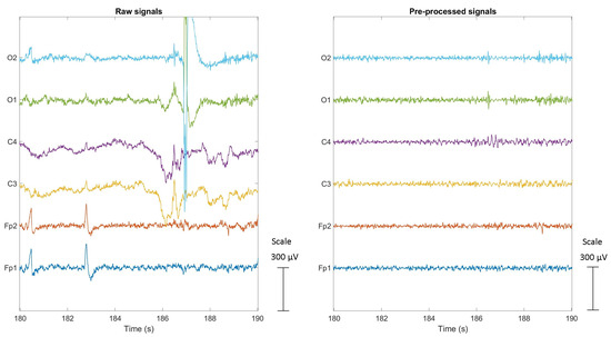 The six EEG signals acquired from the frontal region (Fp1, Fp2), the central region (C3, C4), and the occipital region (O1, O2) of the subjects’ scalps underwent a series of pre-processing steps to remove artifacts and enhance their overall quality. These signals, measured by surface electrodes, reflect the field potentials generated by collective neuronal activity primarily within the cerebral cortex situated beneath the skull. As a result, the EEG signals are attenuated by layers of skull and skin and are typically in the range of 10–100 V in healthy adults. The relatively low amplitudes of the signals make them prone to several forms of artifacts. Specifically, two primary sources contribute to the occurrence of these artifacts. The first source includes additional physiological signals such as cardiac and muscle activities, eye movements, and blinks. The second source involves external factors such as AC power line noise, cable movements, and broken wire, which can further contribute to signal distortions [31].