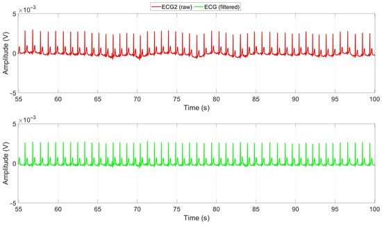 The ECG signals obtained from the chest of each subject were evaluated, and the signal with the highest SNR was chosen. To improve the signal quality and eliminate the baseline drift and artifacts caused by respiration, a high-pass Infinite Impulse Response (IIR) filter with a cutoff frequency of 0.5 Hz was applied to the selected signal [35]. The effectiveness of this filtering process can be observed in Figure 10. The figure illustrates the raw and filtered ECG signals recorded during manual driving of a subject. The red signal represents the raw ECG signal, while the green signal corresponds to the cleaned signal obtained after applying the high-pass filter. The filter effectively removes baseline drift, enhancing the signal quality.