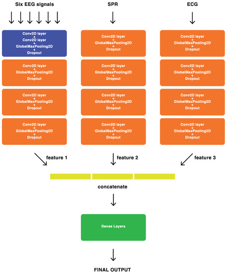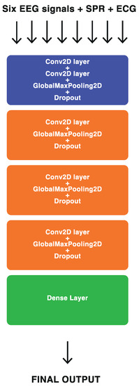 For feature-level fusion, we employed our proposed DL architecture, where the most significant features extracted by the BD-Deep4 model [24] from each signal modality (EEG, ECG, and SPR) were combined to create a new fusion architecture, named ConvNet-Fus. This fusion architecture consists of three separate BD-Deep4 branches: one for EEG signals, one for SPR signals, and one for ECG signals. These three BD-Deep4 branches are then concatenated to combine the features extracted by each individual model. The BD-Deep4 branch responsible for extracting EEG features comprises four convolutional and max-pooling blocks. The first block includes two convolution layers followed by a max-pooling layer. The subsequent three blocks consist of one convolution layer and one max-pooling layer each. The two BD-Deep4 branches that extract SPR and ECG features have the same four blocks, with the distinction that the first block has only one convolution over time. This is because SPR and ECG signals have single channels and do not require convolution over space. The final block of ConvNet-Fus incorporates a concatenation layer to combine features obtained from each individual BD-Deep4 branch. This is followed by two dense layers, with the last layer utilizing softmax activation for the two-class classification. To assess the advantages of feature-level sensor fusion, the architecture of the ConvNet-Fus was modified to extract the features from EEG signals only, then those from EEG and SPR signals, then those from EEG and ECG signals, and finally those from EEG, SPR, and ECG signals. The detailed architecture of ConvNet-Fus is illustrated in Figure 12.