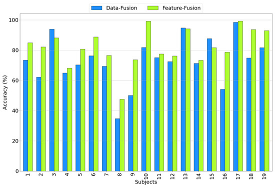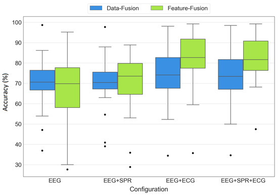 By observing the accuracy values achieved for subjects in the EEG+SPR+ECG configuration, considering both data fusion and feature fusion approaches, it became evident that several subjects obtained relatively low accuracy scores. This discrepancy can be attributed to the inherent nature of the intra- and inter-individual variability of physiological signals. Numerous factors can influence the physiological signals within a subject, highlighting the need for a larger and more diverse dataset to encompass the wide range of biological signal variations. In our study, we recruited 19 volunteers to participate in the experiment. However, it is important to acknowledge that a larger number of subjects would further enhance the accuracy and increase the generalization capabilities of the models.