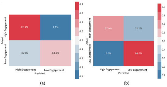 In this section, the results obtained by applying the presented models to the physiological signals recorded from the test subjects are presented. The results include models for both the data-level fusion and feature-level fusion approaches. As described in Section 2.4, after the pre-processing steps, the synchronized data were segmented into 3 s windows, which were then labeled as “0” for high engagement intervals or “1” for low engagement intervals. The experiment involved a total of 19 subjects who participated in both manual and autonomous driving, resulting in a dataset comprising 7366 intervals in total.