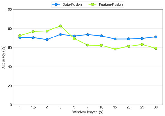 Similar to the BD-Deep4 model used for data-level fusion, the model parameters for ConvNet-Fus were selected based on the original article [24] and its implementation in [40] and fine-tuned through experimental iterations. The model parameters are summarized in Table 2. For the ConvNet-Fus model, Adam was again chosen as the preferred optimizer. To address overfitting, a regularization parameter (L2 penalty) of 0.7 was introduced in the dense layers. The categorical cross-entropy loss function, commonly used for classification tasks, was employed to measure the performance of the ConvNet-Fus model. During the training process, the maximum number of epochs was set to 50. Early stopping was implemented during training, which allowed the process to stop after 20 epochs if no significant improvement was observed. A batch size of 128 was employed during the training process. A detailed comparison of the results obtained from different configurations is provided in Section 3.