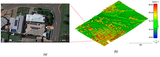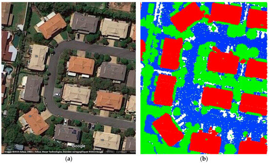 Zone A of Brisbane city; (a) Google Maps image; (b) LiDAR point cloud obtained by categories; Red is buildings, green is vegetation, blue is terrain.