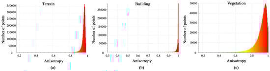 Histograms of calculated anisotropy feature values are shown in Figure 6a–c. The histograms show that most terrain points have distributions with values between 0.9 and 1, while building points have values close to 1 and the vegetation class has distributions with values between 0.75 and 1. This difference in histogram behavior highlights the importance of the anisotropy feature.