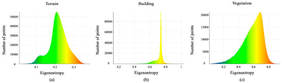 The histograms of the eigenentropy feature are shown in Figure 7a–c. In fact, the majority of points have values less than 0.3 for the terrain class, values between 0.7 and 0.8 for the building class, and values between 0.3 and 0.75 for the vegetation class. As a result, the eigenentropy feature can be useful for the separation between the three classes.