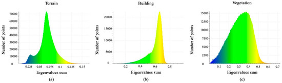 The eigenvalues sum is represented as a histogram for each class shown in Figure 8a–c. It can be noted that the value distributions differ significantly between the vegetation, buildings, and terrain classes. This feature is useful to extract terrain classes, but it cannot separate building and vegetation classes.