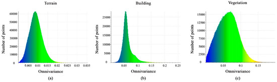 Figure 10a–c shows the calculated omnivariance-feature value distributions very clearly between the classes. The terrain points have values between 0.0025 and 0.016, the vegetation points have values between 0.01 and 0.13, and the values for the building points are between 0.03 and 0.1. As a result, this feature cannot aid in distinguishing the three classes.