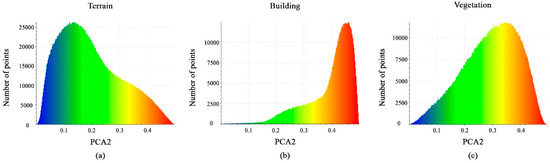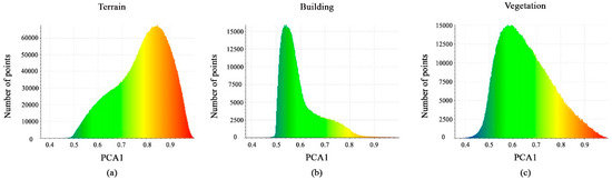 The calculated PCA1 feature values are shown in Figure 11a–c. The majority of points for each class have a distribution interval between 0.5 and 0.8 or 0.9. These minor differences in the histogram of the PCA1 feature will not support the separation of the vegetation, building, and terrain classes; hence, this geometric feature will be ignored.