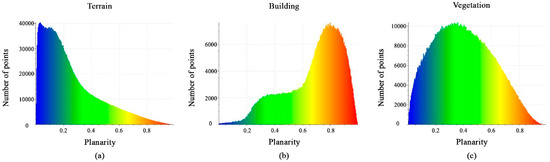 Figure 13a–c shows histograms of the values derived from the calculated planarity features. Each histogram has a different distribution of points, but they all have similar distribution intervals of between 0 and 1. This feature will not be effective for distinguishing buildings and vegetation from the terrain.