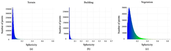 Also, the histograms of the values obtained from the calculated sphericity features are shown in Figure 14a–c. The feature values have different distribution intervals, with the vegetation interval being [0, 0.35], the terrain interval being [0, 0.1], and the building interval being [0, 0.05]. In fact, this feature is important in distinguishing terrain, building, and vegetation classes.