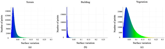 Figure 15a–c shows histograms of the calculated surface-variation feature values. The histograms show the distribution of points at the interval [0, 0.075] for terrain points, for the building class, most points have values at the interval [0, 0.02], whereas vegetation class points have values at the interval [0, 0.15]. Finally, the surface-variation feature can aid in the target classification.
