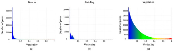 Histograms of the calculated verticality feature values are shown in Figure 16a–c. Most terrain points are located between 0 and 0.05, whereas building points vary from 0 to 0.1 and vegetation class points are between 0 and 1. However, the verticality feature is regarded as efficient.