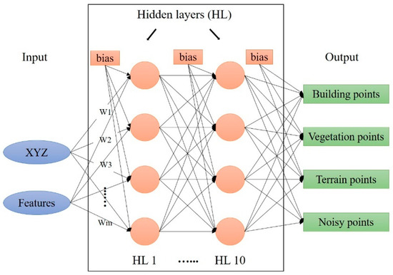 Most of the suggested classification approaches in the literature focus on developing a complex ML classification network for the automatic classification of LiDAR data. The approach suggested in this paper focuses on improving the input layer using basic DL networks. Indeed, it calculates the geometric features of the input point cloud and analyses their values regarding the class that they belong to (see Section 4). Once the efficient geometric features are recognized and adopted in the input layer, the training stage can start to calculate the trained classification model.