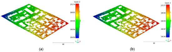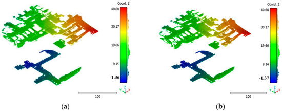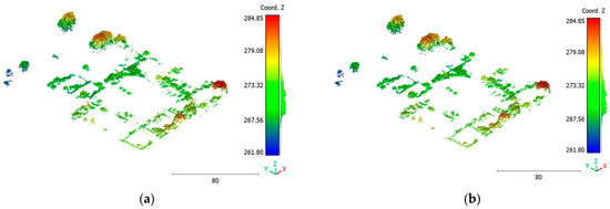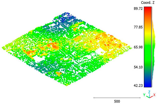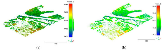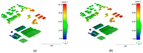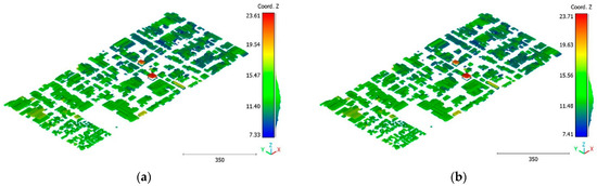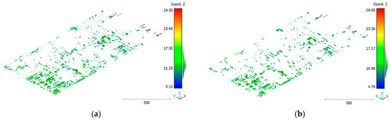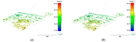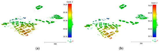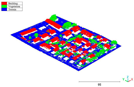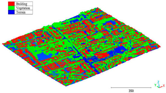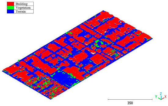 On the other hand, the second strategy adopts a two-step approach for classifying the point cloud. The initial step focuses on distinguishing buildings from non-building objects, while the second step classifies the non-building objects into three categories: vegetation, terrain, and noise, achieving a score of 98%. This strategy’s advantage lies in its ability to prioritize the accurate identification of buildings, which are often of utmost importance in various applications. By separating the classification into two stages, the algorithm can specifically adjust the feature-extraction and classification techniques for each step, potentially improving accuracy. Additionally, the division of non-building objects into three distinct classes allows for a more detailed and precise analysis. This strategy offers flexibility for the customization and fine-tuning of algorithms for each class, allowing for tailored approaches. However, there is a potential risk of information loss during the intermediate classification stage, although this can be mitigated by careful feature and algorithm selection.