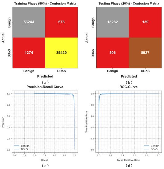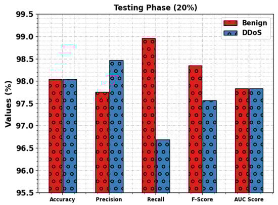 Figure 3b exemplifies the confusion matrix attained by the WSEO-HDLCS system on 20% of the TS set. The results signified that the WSEO-HDLCS methodology has recognized 13,282 instances under the benign class and 8927 instances under the DDoS class. Following this,
