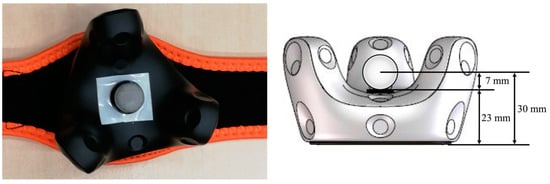 For the tracking validation of the VIVE Tracker 3.0, the movement data of three trackers were compared with the movement data measured with a Vicon system. For this purpose, as shown in Figure 1, one 14 mm Vicon marker was attached to each tracker. While the coordinate origin of the VIVE tracker is in the mounting thread at the bottom, the origin of the spherical Vicon marker is in its center. Due to this difference in origin, the orientational information from the trackers was used to determine which axis needed to be adjusted regarding the position of the Vicon marker. As can be seen on the right side in Figure 1, the difference between the coordinate origins of both measuring systems was 30 mm. Accordingly, the recorded coordinates of the VIVE tracker were corrected using this offset to allow for a comparison of the trajectories of both systems. This correction was applied directly in the Unity scene by adding an empty game object defined as a child, which adjusted the translations and rotations.